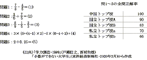 | 京都大学西村和雄教授による「日本を救う私の緊急教育5提言」という一文は、昨年5月に週間東洋経済に発表されたので、ご存じの向きも多いだろう。 http://www.math.hc.keio.ac.jp/edu/5proposals.htm ![]() 上の資料をみていただきたい。 現役を30年以上前に終えている私でさえ、全問できる小学校程度の問題なのに、私立トップ校bでは全問正当は66%。 西村教授曰く: 私大の場合、ほとんど数学が入試科目にないか、あるいは社会科との選択となっている。その結果、入試で数学を選択していない学生のうち二割ぐらいが分数や小数でつまずいている。 私も入試に数学のない大学しか受験していないが、上の問題は難なく解けた。 要するに、入試に関係あるかないか以前の、学校で何を学ぶか、学ばせるかの問題なのではないだろうか。文部省は、カリキュラムにある上記のような問題が解けない子供を作るより、いっそのことカリキュラムからこの項目を外してしまおうという狙いらしい。大人になっても必要ないものは学ぶ意味がない、なんて本当だろうか。私は、家庭の中にずっといて、妻として母としての役割しか持たなかったが、子どもの頃に難しい問題にも挑戦し、暗記も沢山した。その当時はこんなしんどいことやっても、将来役立つことはないだろうなと思ったりもした。だが、下から見たときに登れやしないと思った山の頂上に立ったときは、達成感があったし、昨日の自分より今日の自分が少しでも向上することの大切さも学んだ。 やっぱり、子どものうちになんでも挑戦しておいた方がいいと思う。 他人と比べるから、自分がそこまでできないときに卑屈になったりするのだと思う。 カリキュラムの内容を減らして、全員のレベルを下げることで、非行少年やひきこもりを防止できるなんてどうしてそんな風な発想になるのだろう。(町村文部科学大臣の「私の提言」(文芸春秋3月号)から、私はそのように読みとった。) 人は人、自分は自分、基準が自分自身に持てるなら、社会にも一人一人を尊重する土壌があるならば、もっと一人一人の選択肢も増えるし、それが「ゆとり」につながるのだと思う。むろん、大人たちがお手本を示す必要も大いにあるだろうし、自らを律していく厳しさを持たなければ、子どもは直ぐに大人の正体を見破ってしまうだろう。そうなったら、子ども達の チャレンジ精神の芽を摘むことになるだろう。 個人、個性の尊重。言葉の上だけならもう何年も前から叫ばれている。なのに、実態は全然違う。例えば、ある人を判断する基準に多くの人が出身学校やら、就職先など、その人個人ではなく、付録を重視していないだろうか。最近は随分様子が変わったと言われているが、それでも、わが子を荒れた公立だけには行かせたくないから、受験させてどこでもいいから私立へ、という話を良く聞く。私立ならどんな学校でも公立よりまし?そうだろうか。「私立」という半ば幻想で親たちは子どもの貴重な体験の場を奪っていないだろうか。現実社会の縮図は、あるとしたら公立学校にあるだろう。それを遠ざけて、わが子には少しでもいい環境を、というのは、分からないではない。学校が荒れているというのを私は実際に知らないからそんな暢気なことが言えるのよ、とおしかりを受けるかもしれない。だから、公立学校に選択の自由があれば、環境の整った公立を選ぶこともできるようになるだろう。その選択が許されない現在、親御さんにしてみれば、他に方法がないのかも知れない。 だが、本来子どもの学校を決める基準はその学校の教育方針なり教育環境であるはず。それが、「私立」「偏差値」で十把一絡げにされていないだろうか。 全員ヨーイドンでスタートし、ゴールも決まっているから、如何に助走をうまくやるか、ゴール地点にいかに人より先に到達するか、無我夢中で走り続けた者だけが、ゴールインできる。その手の競争は、周囲の景色を眺めながら走りたい人や、早さより美しさを求めたい人などは問題にされないのだ。ましてや、落伍しそうになった人に手を貸している余裕はない。「ゆとり教育」がその余裕を生み出すことを目指すというが、「キレたり」いらいらするのは、授業内容のレベルを下げて易しくして、みんなで助け合って勉強することでなくなる(寺脇氏-日本の論点)とは思えない。周囲の人たちへの思いやり、相手の立場になってみる、そういうことのできる人間は、新学習指導要領の「ゆとり」で実現はできない。家庭や社会そのものの果たす役割の方が大きいはずだ。何もかも学校で、というのはまず無理だろう。学校は勉強するところであって、お箸の持ち方や挨拶を教える場所ではないし、思いやりは教科書から学ぶものではない。全体のレベルを下げて、国際的に通用しない人間ばかりになり、その上、キレる子は減らず、では、アブハチ取らずになってしまう・・・ さてそこで、西村教授が謳う緊急提言。提言4と5は私には判断できな